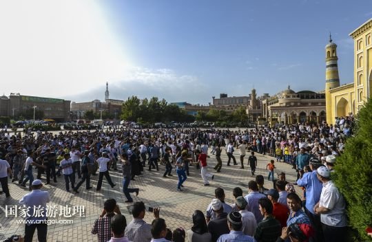 8月8日,穆斯林群眾完成禮拜后在新疆喀什的艾提尕爾廣場(chǎng)上跳起傳統(tǒng)舞蹈“薩滿舞”。