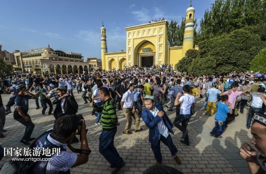 當(dāng)日,近3萬(wàn)名各族穆斯林群眾前往新疆最大清真寺——艾提尕爾清真寺做禮拜,喜迎開齋節(jié)。