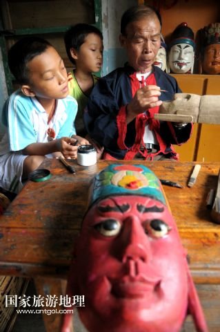譚圣慈老人今年72歲,從22歲開始學(xué)雕刻儺戲面具,迄今,已經(jīng)堅持了50年。老人說,他制作的面具因工藝精湛,造型優(yōu)美,曾吸引遠方的客人高價購買。但是,卻少有人來學(xué)習(xí)面具的雕刻與制作。儺戲于2006年被列入非物質(zhì)文化遺產(chǎn)名錄之后,政府加大了保護力度,但因為面具的制作周期長、工序復(fù)雜,銷售渠道少等原因,仍無法吸引年輕人學(xué)習(xí)雕刻的興趣。為了收到心儀的徒弟,傳承這獨到的技藝,他到處發(fā)布免費收學(xué)徒的信息。在他的堅持下,今年暑期,鄉(xiāng)里有兩名對面具制作感興趣的男孩來到譚圣慈身邊學(xué)藝。老人高興地說:“我給他們講很多故事,就是希望他們能對此提起興趣,愛上木面雕刻,別讓這老手藝失傳了。” /新華社發(fā)