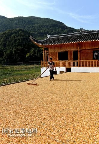 國(guó)家旅游地理 湖北恩施8月22日訊 8月22日,湖北省宣恩縣水田壩村二組農(nóng)民侯慶云在吊腳樓前晾曬玉米。初秋時(shí)節(jié),湖北省恩施土家族苗族自治州宣恩縣農(nóng)民搶抓時(shí)節(jié),對(duì)玉米等農(nóng)作物進(jìn)行收獲晾曬,山鄉(xiāng)家家戶戶忙“曬秋”,到處是一派豐收景象。 /新華社發(fā)(宋文 攝)
