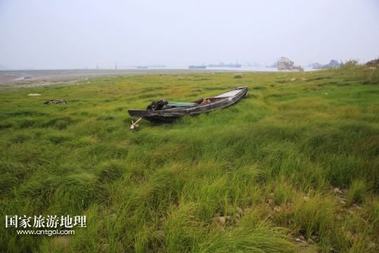9月19日,漁船擱淺在鄱陽湖江西九江市蛤蟆石水域附近長(zhǎng)滿青草的湖床上。