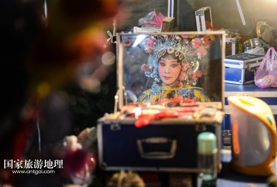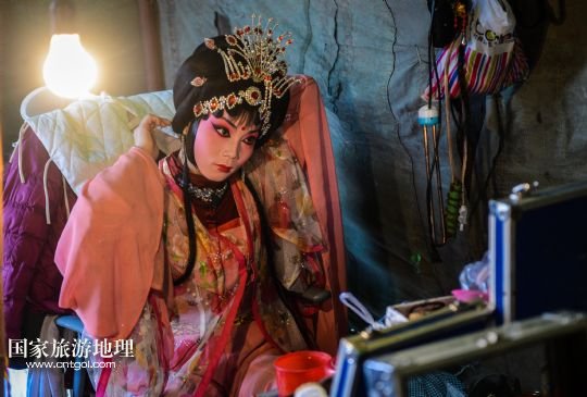 1月3日,武義壺山婺劇團(tuán)演員在上臺(tái)前整理頭飾。