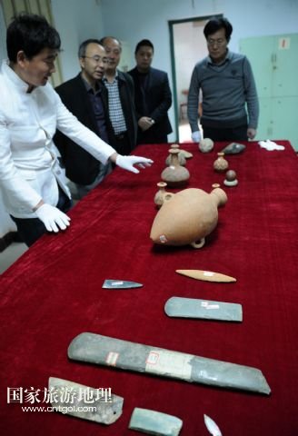 3月27日,龍崗寺文物工作者向參觀者介紹玉鏟、玉刀、尖底瓶等出土文物。
