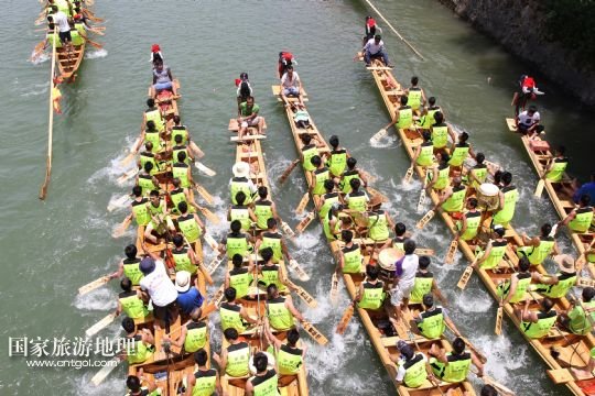 國家旅游地理 湖南永州6月16日訊 6月16日,參加道縣龍船賽的龍船在水面上角逐。